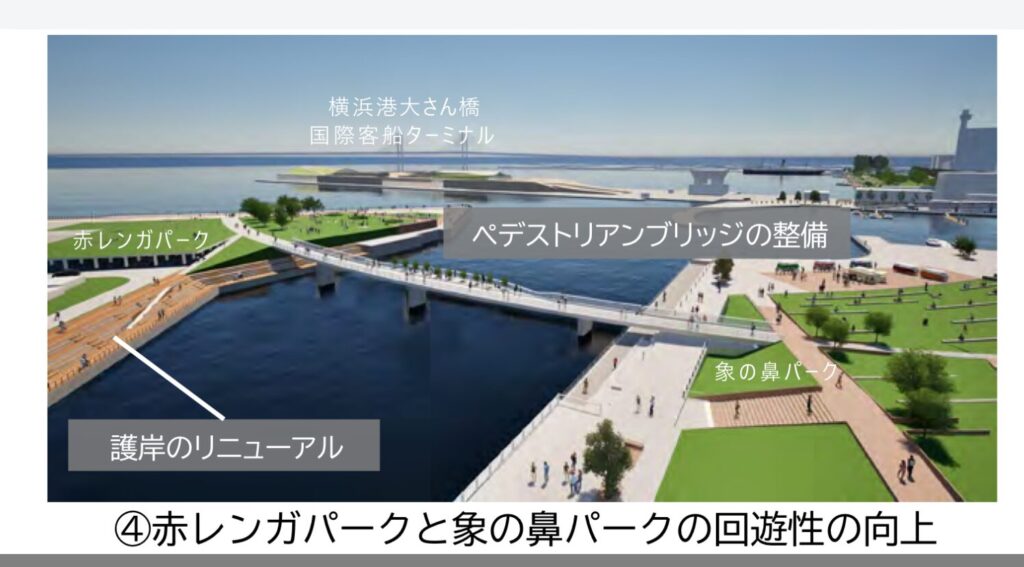 赤レンガパークと象の鼻パークの回遊性の向上のため、ペデストリアンブリッジの整備計画が進められています。
