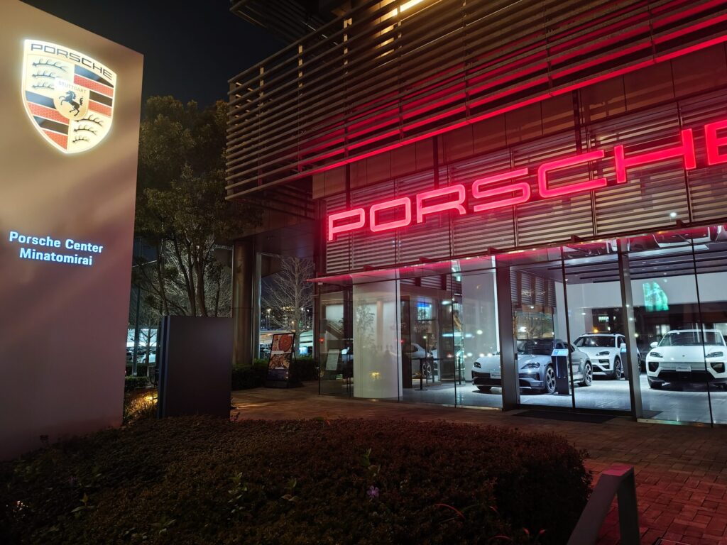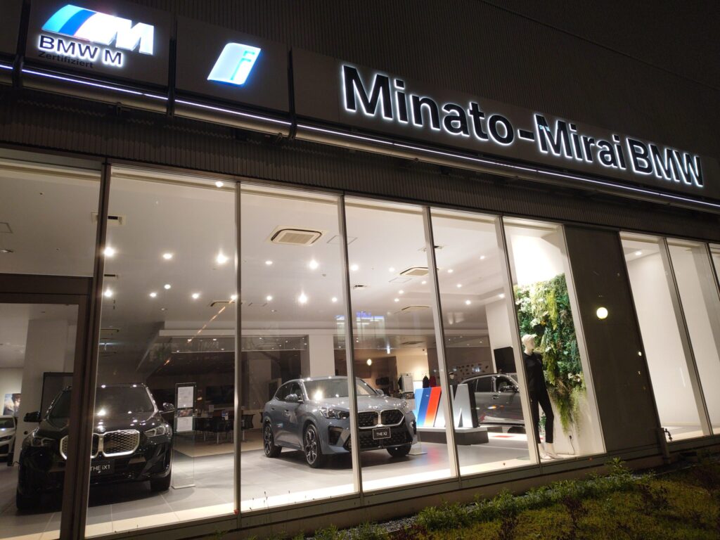 ウェスティンホテルのすぐ近くに位置する、開放感あふれるショールーム。最新モデルがずらりと並び、夜のライトアップされた姿はみなとみらいの夜景の一部として非常に映えます。