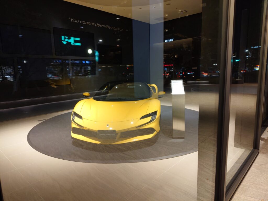 夜のライトアップ演出: 夜になると、ショールームの照明が街を彩る街灯の一部となり、展示車がまるで宝石のように輝きます。この光の演出が、ブランドのステータスを夜の街に静かに、かつ力強く主張します。