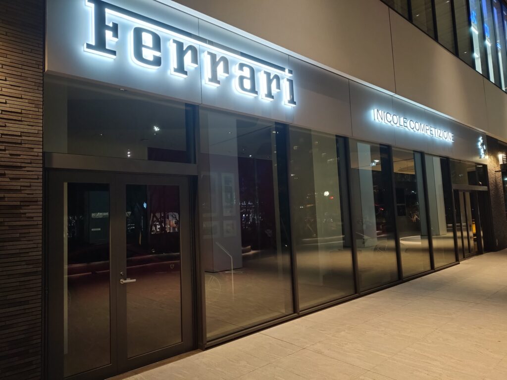 夜のライトアップ演出: 夜になると、ショールームの照明が街を彩る街灯の一部となり、展示車がまるで宝石のように輝きます。この光の演出が、ブランドのステータスを夜の街に静かに、かつ力強く主張します。