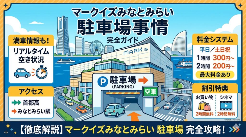 MARK IS みなとみらい駐車場の基本情報をまとめました。約900台を収容する大型の地下駐車場で、近隣のランドマークプラザ等との共通割引サービスが充実しているのが特徴です。