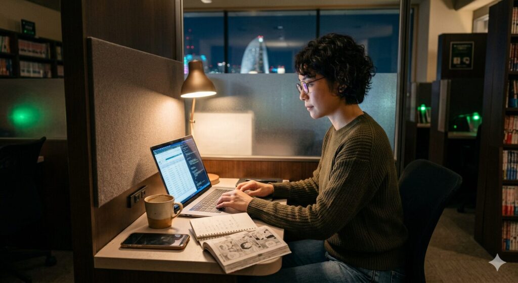 個室タイプには「鍵がかかる完全個室」と、上が開いている「ブースタイプ」があります。深夜の滞在、特に仮眠をとる場合は、必ず鍵付きの完全個室を選び、入室後はすぐに施錠を確認してください。
