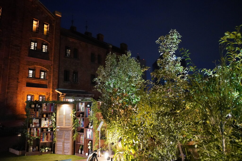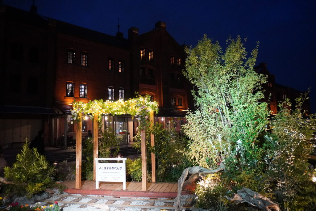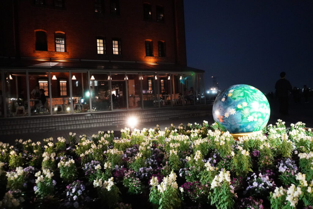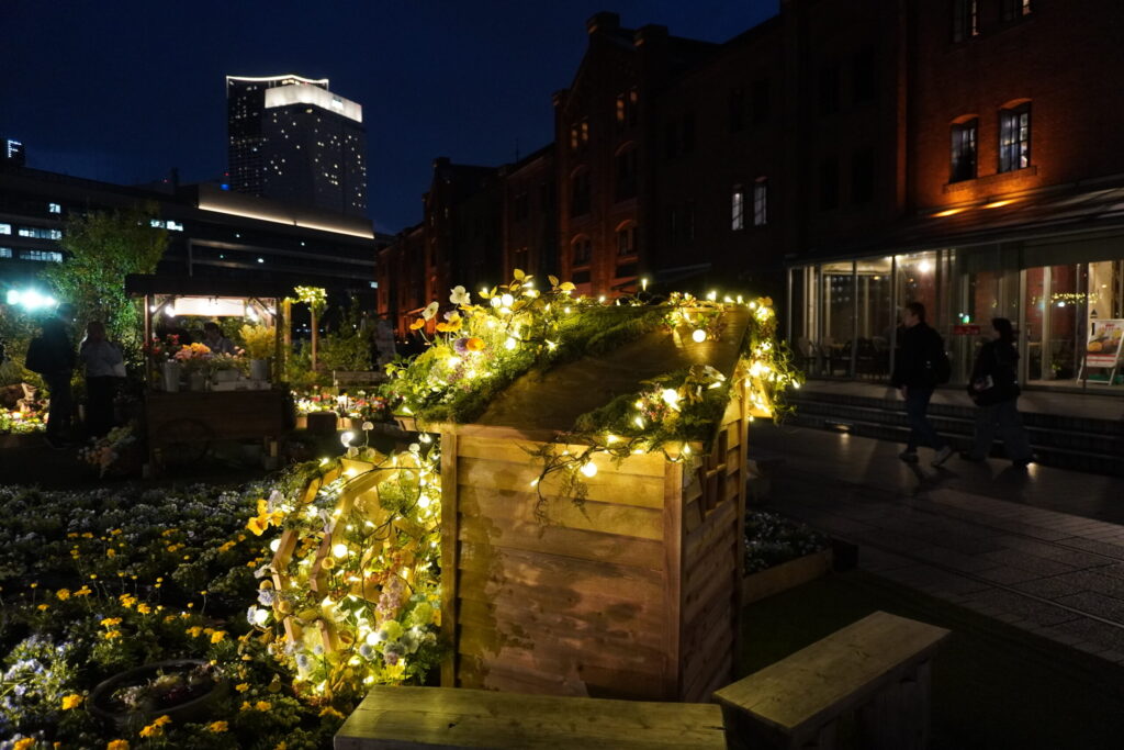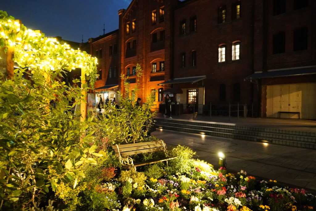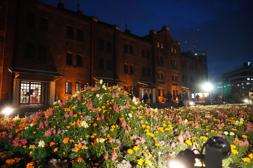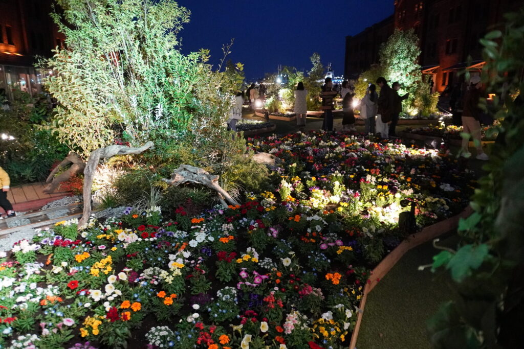オレンジ色にライトアップされた歴史ある赤レンガ倉庫を背景に、闇の中に鮮やかに浮かび上がる花々の姿は、まさにこの時期の横浜でしか出会えない特別な景色。みなとみらいの夜景が花園の向こう側にきらめき、潮風とともに贅沢な没入感を味わわせてくれます。