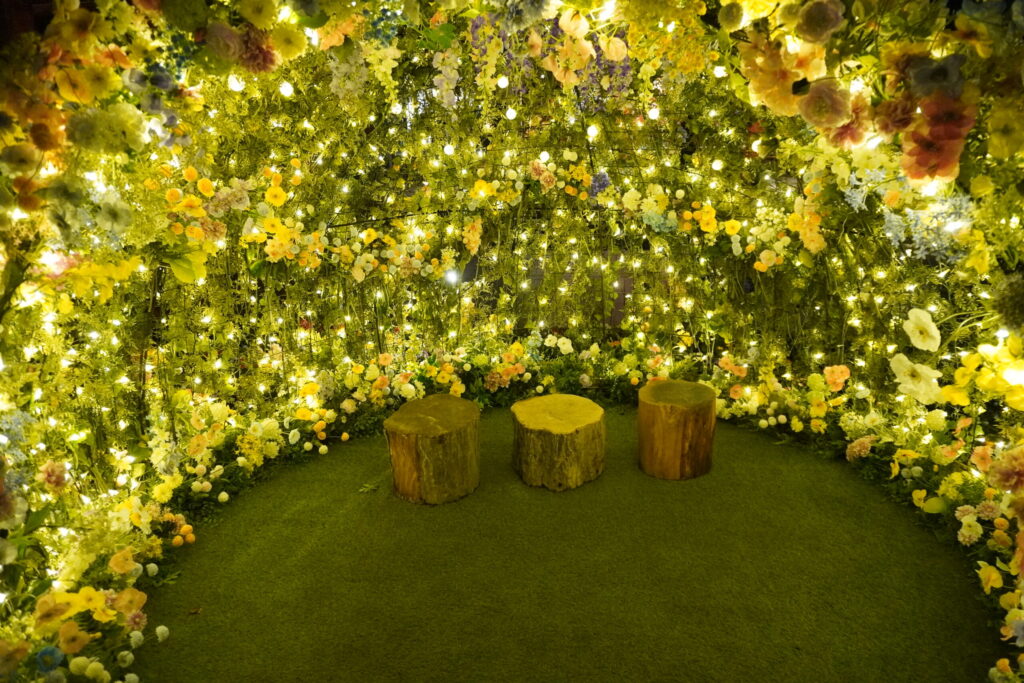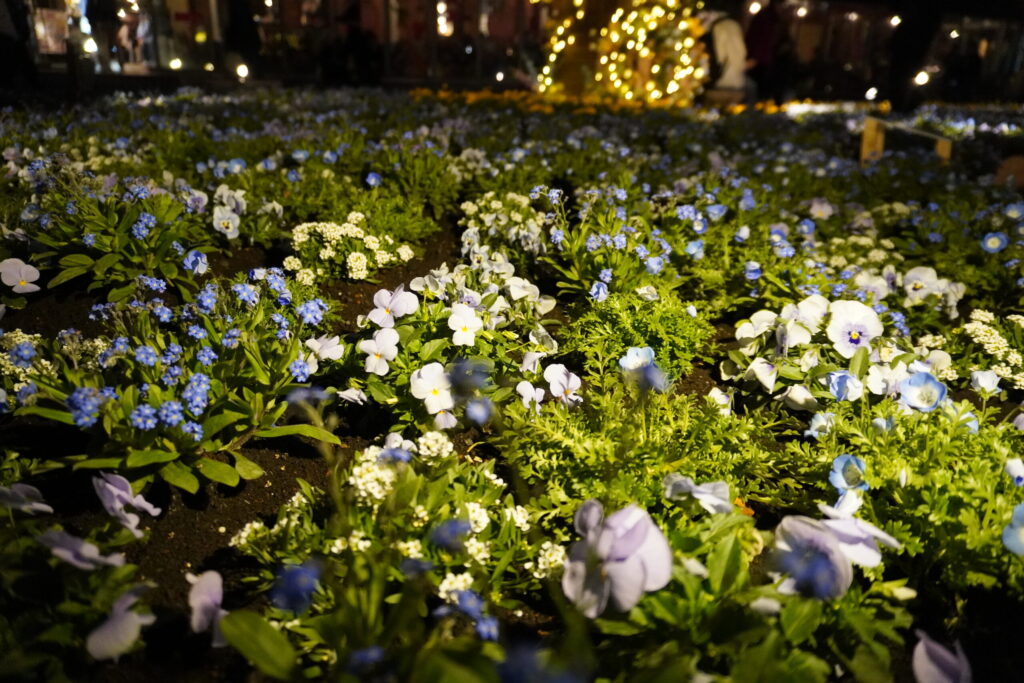 日が落ちた後の「FLOWER GARDEN 2026」は、昼間の賑やかさとは打って変わって、静かでドラマチックな時間が流れています。
