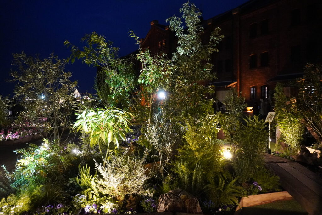 オレンジ色にライトアップされた歴史ある赤レンガ倉庫を背景に、闇の中に鮮やかに浮かび上がる花々の姿は、まさにこの時期の横浜でしか出会えない特別な景色。みなとみらいの夜景が花園の向こう側にきらめき、潮風とともに贅沢な没入感を味わわせてくれます。