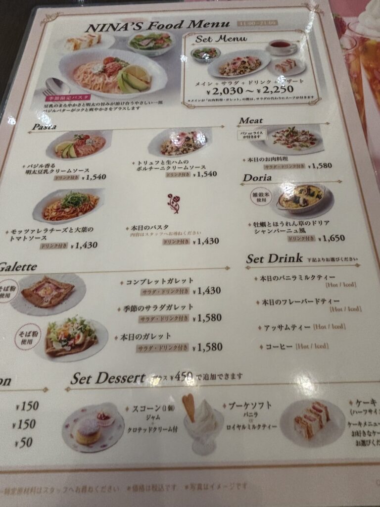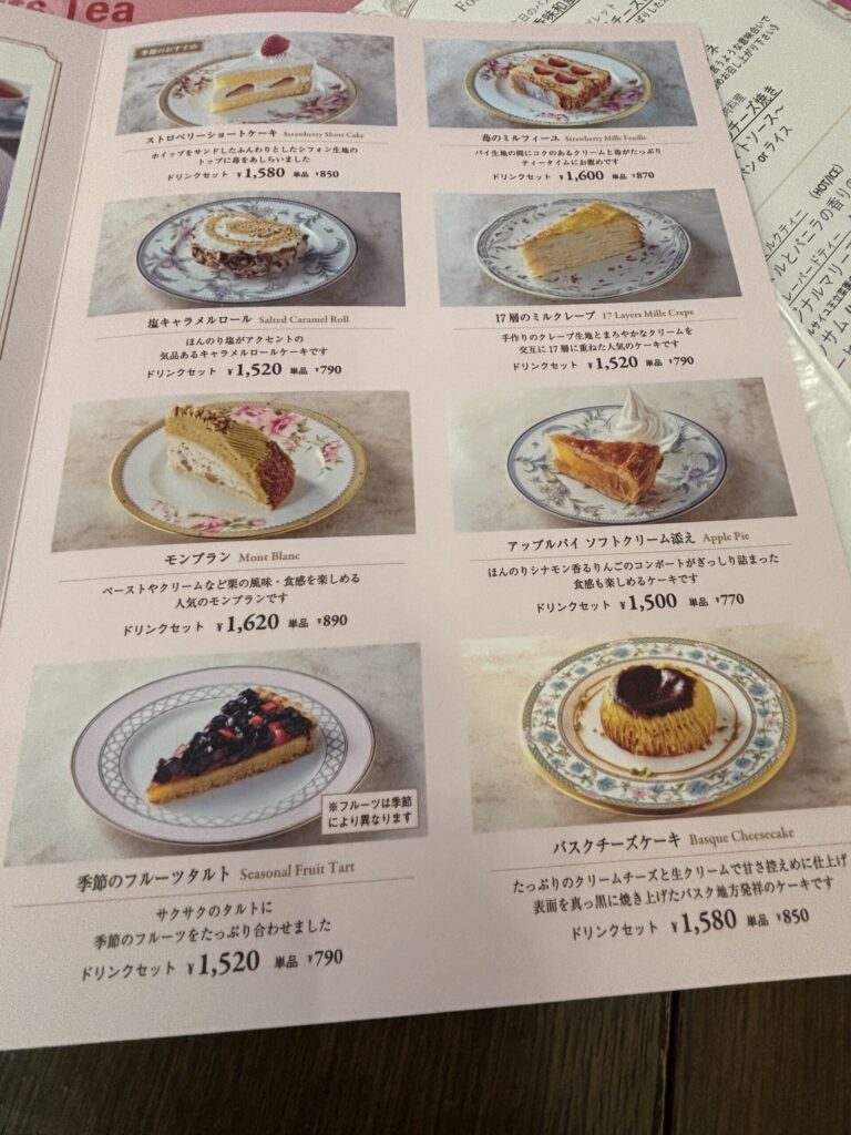 フランスのフレーバードティーをはじめ、ケーキ、ガレット、パスタ、そして季節のアフタヌーンティーなど非常にメニューが豊富です。