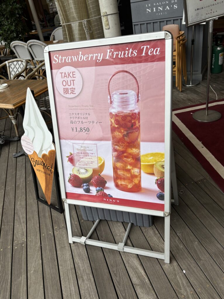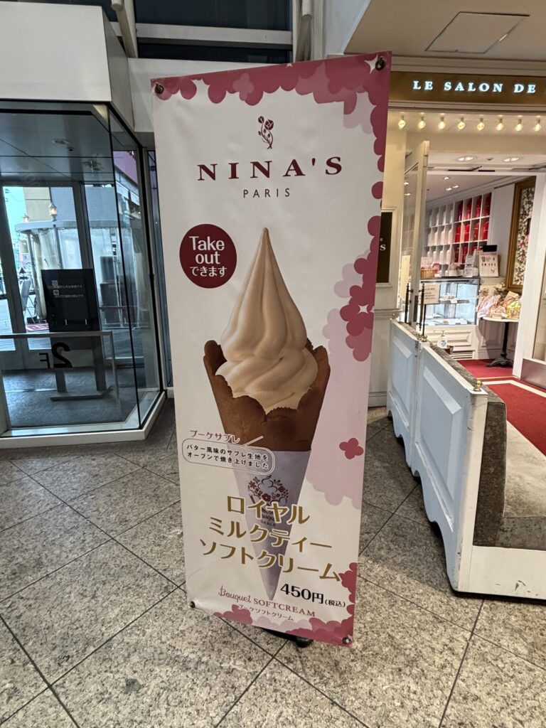 ロイヤルミルクティーソフトクリーム: 450円(ブーケサブレコーンが人気)などテイクアウトも可能です。