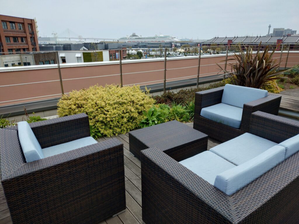 開放感抜群のテラス席:目の前には横浜港、赤レンガ倉庫、ベイブリッジ、ハンマーヘッドなどが一望できます。まさに「隠れ絶景ポイント」と称されるほどのパノラマビューです。